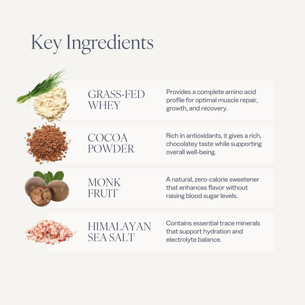 This is whey protein made for women. Kickstart your health & fitness journey with the perfect balance of nutrients to fuel your goals. Each serving delivers 20g of grass-fed, pasture-raised whey protein with a complete amino acid profile to support lean muscle and sustained energy—without the sugar, fillers, or artificial junk. Formulated with just 6 clean ingredients, it's low-lactose, low-carb, and sweetened naturally with monk fruit. No stevia. No added sugar. No aftertaste. Just smooth, delicious flavor in every scoop. Available in two crave-worthy flavors: Chocolate – rich, creamy, and turns your shake into a healthy treat. Vanilla – light, silky, and blends perfectly into smoothies, oats, or pancakes. ✓ 20g protein per serving ✓ Only 90 calories ✓ 0g added sugar ✓ No stevia or artificial sweeteners ✓ Easy to digest, low lactose ✓ Only 6 all-natural ingredients ✓ Grass-fed, pasture-raised whey ✓ Manufactured in the USA ✓ 3rd party lab tested
