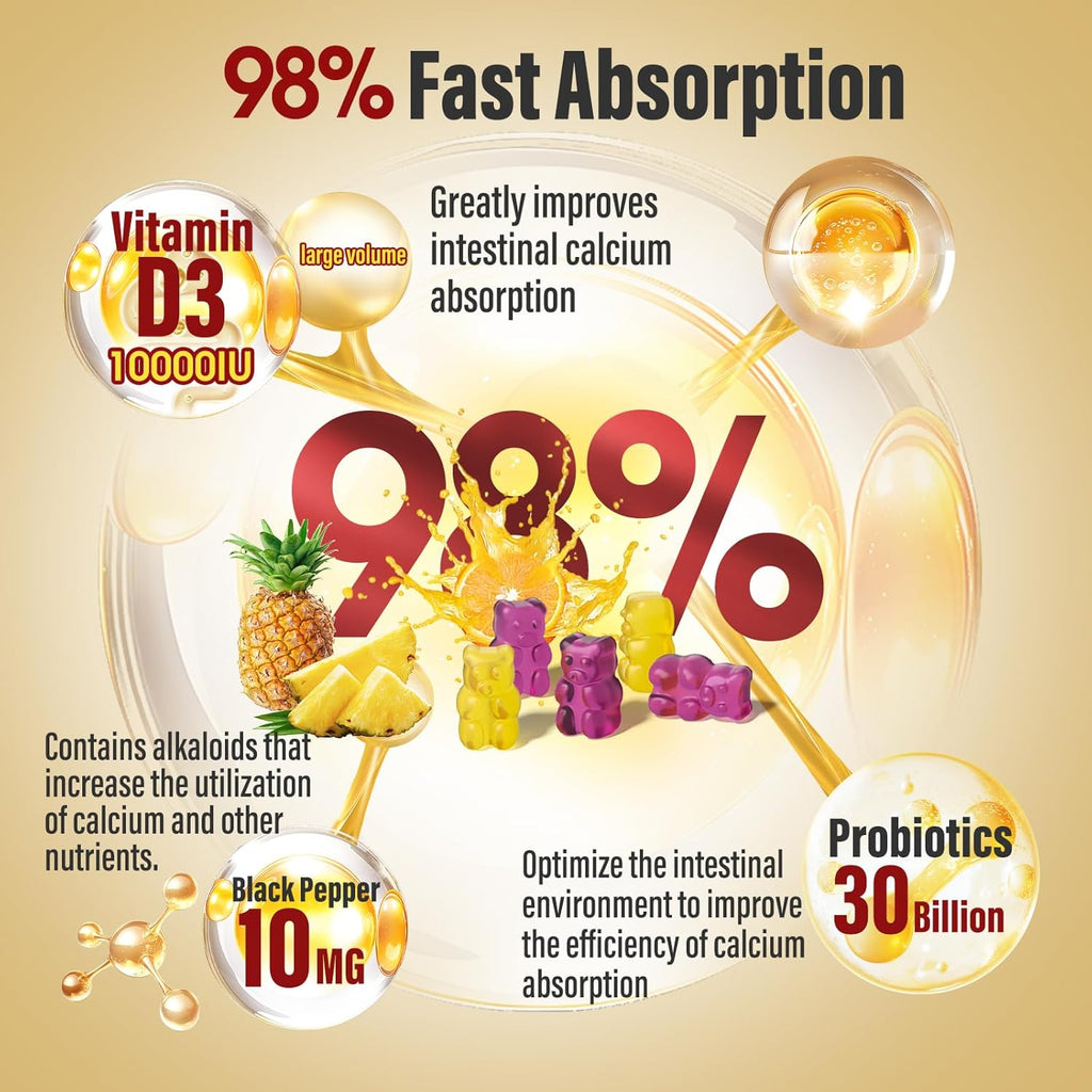 - Ultimate Calcium Absorption: Calcium absorption can be slow, which is why we've added 10,000 IU of Vitamin D3 and 200mcg of Vitamin K2 to support calcium absorption and utilization. The piperine in black pepper helps enhance nutrient absorption in the gut, while 30 billion active probiotics improve gut health. Together, these ingredients significantly enhance calcium absorption, surpassing most other calcium supplements.