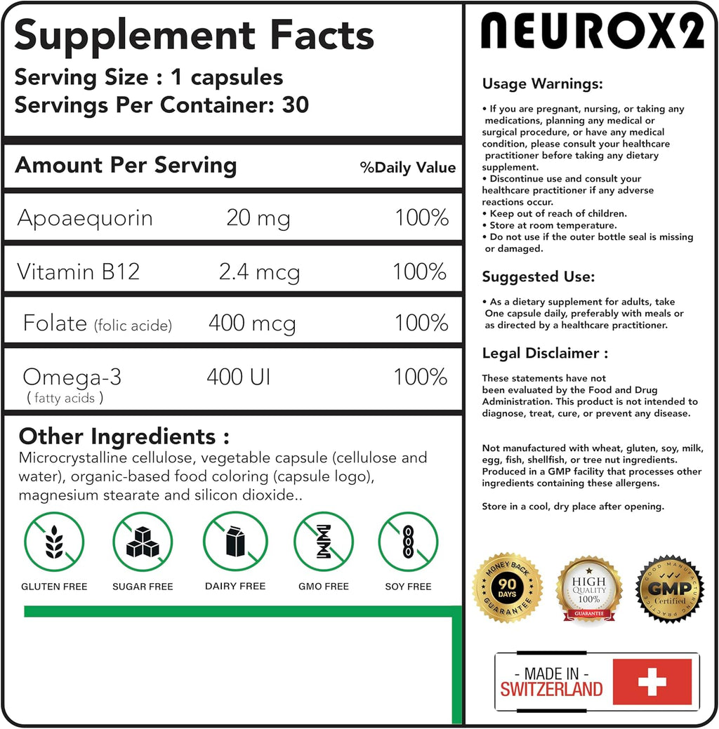- In contrast to other products that may contain allergens such as milk, soy, or gluten, NEUROX2 is free from these substances. It is scientifically classified as an Apoaequorin amino acid with no known side effects. The recommended daily dosage is one capsule, selected based on your age range.