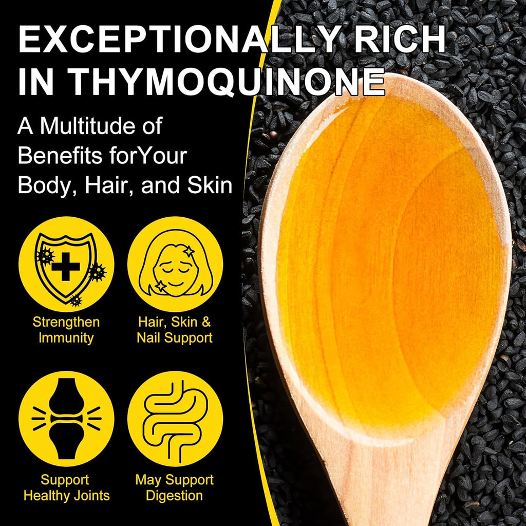- 😋Black seed oil boasts the highest concentration of thymoquinone,delivering unparalleled benefits for your body, hair and skin.Our pristine, light-hued oil boasts an extraordinary 3-4 times the thymoquinone potency compared to ordinary black seed oils.