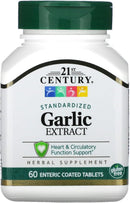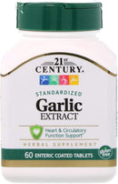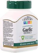 Garlic Extract - 60 Coated Tablets Compare Active Ingredients To GarliqueOdor Reduced Formula to Help Maintain Circulatory Efficiency Quantity: 60 Enteric Coated Tablets Description: 21st Century's Garlic Extract provides a maximum concentrate of allicin yield thought to be responsible for supporting cardiovascular health. 21st Century's standardized herbal extracts are thoroughly tested to assure specific levels of the important active ingredients are present for maximum benefit. Instructions: Keep out of reach of children. Do not use if product appears to be tampered with or seal is broken. Store at room temperature. For Your Health: Unconditionally guaranteed for purity, freshness and label potency. No Sugar, Salt, Yeast, Preservatives, Artificial Flavors or Colors. Directions: Take up to two (2) coated tablets daily with any meal for maximum daily results, or as directed by a health care provider.100% Vegetarian.