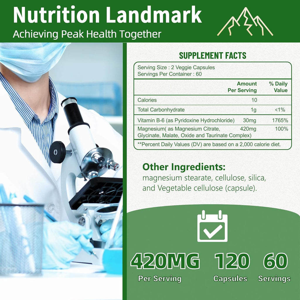 Magnesium is an essential dietary mineral involved in hundreds of different processes in our body.* It has a central role in ATP generation and contributes to muscle contraction,relaxation,normal nerve function, and release of neurotransmitters.* Chronic stress,soil degradation,and poor food quality make it tough to get your fill of magnesium. In fact,48% of Americans don't get enough. Nutrition Landmark has you covered with the comprehensive blend of 5 forms of magnesium, magnesium glycinate, magnesium malate, magnesium taurate, magnesium oxide & magnesium citrate. They work together ro replenish your magnesium levels and support overall wellness.* It's designed to be fast absorbed without upsetting the stomach.* Plus, Vitamin B6 enhances magnesium uptake while supporting energy metabolism, brain function, and mood balance.* Suggested Use: For adults, take two (2) capsules daily, preferably with a meal, or as directed by a healthcare professional. Note: Consult your healthcare professional prior to using if you are pregnant, nursing, taking any medication, or have a medical condition. Discontinue use and consult your healthcare professional if any adverse reactions occur. Store in a cool and dry place. Do not use if seal is broken or missing. Keep out of reach of children. *These statements have not been evaluated by the Food and Drug Administration.This product is not intended to diagnose,treat,cure,or prevent any disease.