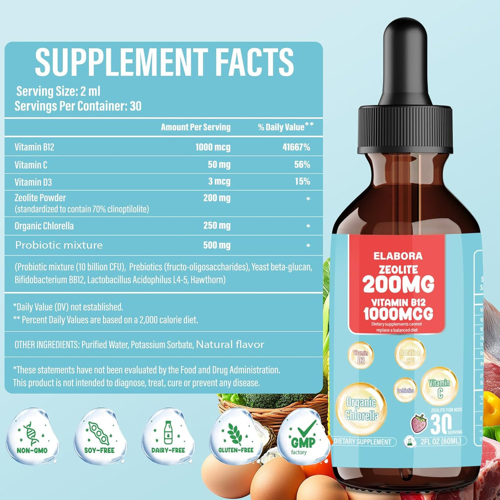 - Advanced Formula - Our zeolite liquid features a unique blend of 11 ingredients. The synergistic effect of 200mg zeolite and 250mg organic chlorella, along with 1000mcg of vitamins B12, C, and D3, provide essential nutrients that support overall wellness. This revitalizing blend helps promote overall wellness, supporting your child’s natural energy and vitality, so they can play and explore freely