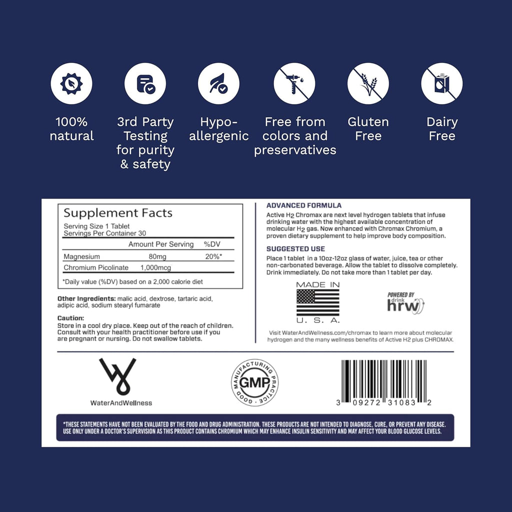 Active H2+ Chromax tablets are formulated to react with water and generate molecular hydrogen. Each tablet contains ingredients including magnesium and Chromax chromium, which are known to support normal metabolic processes and energy production. This product is intended to complement a balanced diet and healthy lifestyle. Developed by a team with over 40 years of experience in water science, Water and Wellness offers high-quality wellness solutions grounded in research and purity.