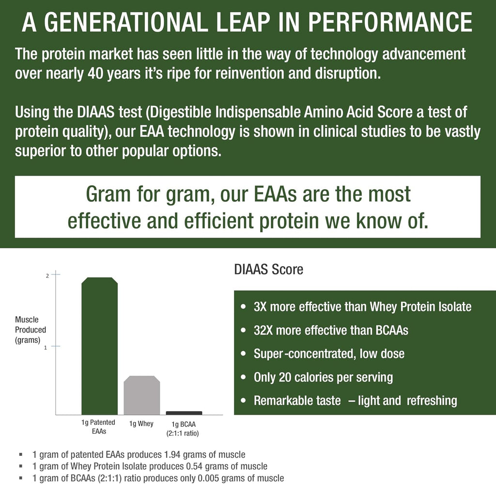 - Gram for gram, our EAAs are the most effective protein we know of. 3x more effective than whey protein isolate, 32x more effective than Branch Chain Amino Acids.* Optimized with the right amino acids ratios to build muscle and keep the body well-supplied with critical amino acids. Available in two flavors: Wildberry and Lemon Lime!