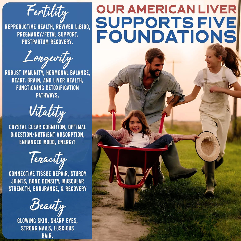 Introducing the FIRST EVER, ALL-AMERICAN BEEF LIVER capsules, packed with essential nutrients to: Boost Energy 🚀 Strengthen Immunity 🛡️ Promote Fertility 👶 Create Vitality 🌟 🏅Highest Quality Standards: Our pure, organic bovine liver is 100% Grass-Fed, 100% Grass-Finished, 100% USA Pasture-Raised, 100% Freeze-Dried, Non-Defatted, with absolutely ZERO pesticides or herbicides (such as glyphosate) — NO hormones, NO antibiotics and completely GMO-Free. Our cattle are BSE-Free and will NEVER receive mRNA vaccinations. 🇺🇸 Our American Commitment 🇺🇸 We source from small, regenerative U.S. ranches and uplift local family farms — our nation’s bedrock. Unlike ALL the other brands, we will NEVER: ❌ Buy foreign bottles/capsules/materials ❌ Manufacture abroad ❌ Ship decaying liver from overseas… ✅ From farm-to-bottle, our liver is always fresh and handcrafted, right here in the beautiful U.S. of A. 🇺🇸 One of the Nutrient-Richest Superfoods, liver contains: Vitamins A, D, K, Zinc, CoQ10, Choline, a FULL ARRAY of B Vitamins and B12, Folate, Omega 3s, Bioavailable Heme Iron, Selenium, Copper and Glycine, critical proteins, peptides, & MORE! Our All-American Beef Liver Supports FIVE Foundational Elements: Longevity — Robust Immunity, Hormonal Balance, Heart, Brain, Liver Health, Functioning Detoxification Pathways. 🛡️ Vitality — Crystal Clear Cognition, Optimal Digestion/Nutrient Absorption, Enhanced Mood, & ENERGY! ⚡ Fertility — Reproductive Health, Revived Libido, Pregnancy/Fetal Support, & Postpartum Recovery. 👶 Beauty — Glowing Skin, Sharp Eyes, Strong Nails, & Luscious Hair. ✨ Tenacity — Connective Tissue Repair, Sturdy Joints, Bone Density, Muscular Strength, Endurance, & Recovery. 🦴 Here’s The Truth: Beef Organ Superfoods are the product of Divine Design, and were created with ALL the nutrients we need to THRIVE. Our ancestors understood this — they ate nose-to-tail (the liver first!) FACT: Ancient Israelites THRIVED on liver and organs EVERY DAY as both food and sacred offerings. Rich organ meats FUELED our forefathers, some of whom, it is said, lived for centuries… Thousands of years later, processed foods poison us. We are weaker, age faster, and are sicker than ever before. We are sleeping nation in crippling health, disconnected from our intended diet… NOW is the time to reclaim our roots and AWAKEN! The SECRET to vitality and longevity will never be fake foods or synthetic multivitamins. It was ALWAYS real superfoods designed by our Creator for our perfect nutrition — nutrition that can only come from the likes of beef liver and organs. That's Nutrition as God Intended — Order Today! 🌄