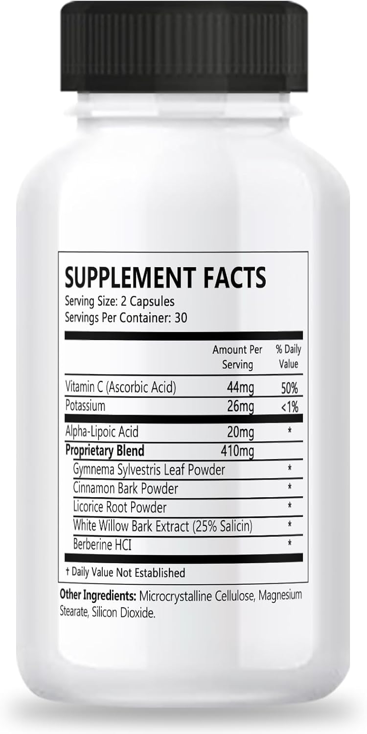 Vitamin C (Ascorbic Acid), Potassium, Alpha-Lipoic Acid, Gymnema Bark Powder, Licorice Root Powder, White Willow Bark Extract (25% Salicin), Berberine HCI, Microcrystalline Cellulose, Magnesium Stearate, Silicon Dioxide.