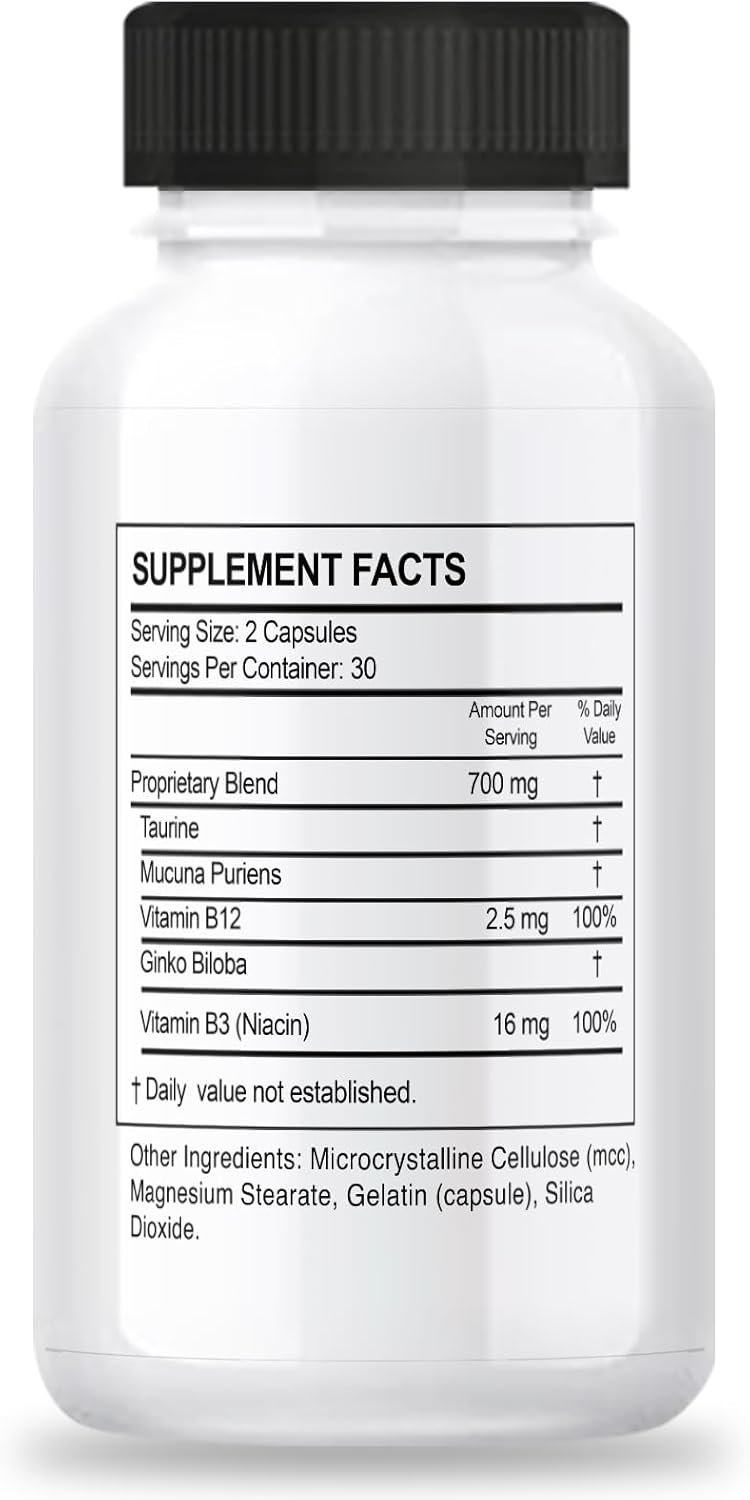 Taurine, Mucuna Puriens, Vitamin B12, Ginko Biloba, Vitamin B3 (Niacin), Microcrystalline Cellulose (mcc), Magnesium Stearate, Gelatin (capsule), Silica Dioxide.
