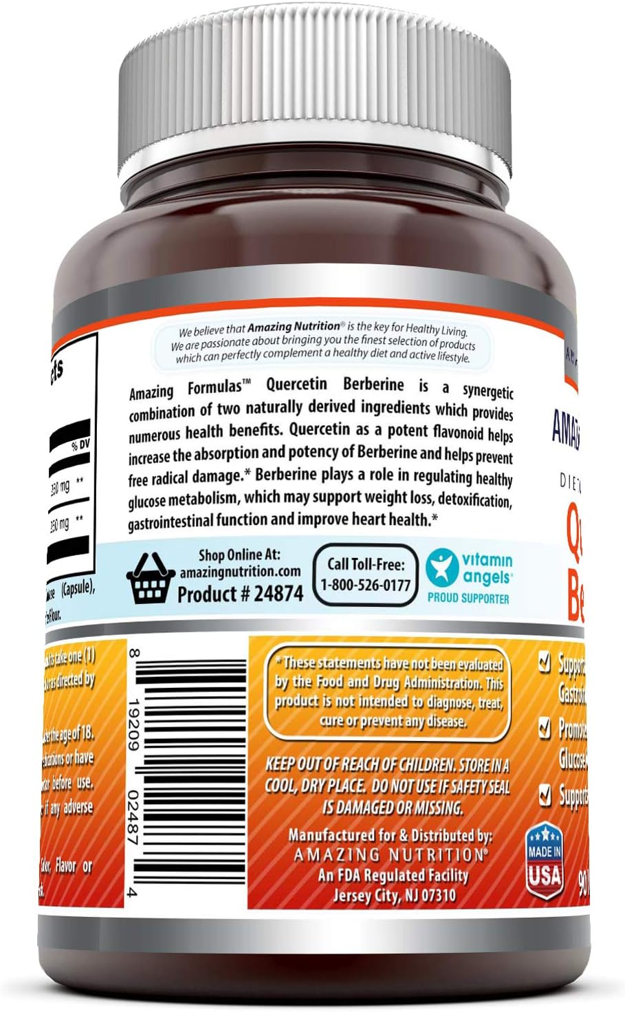 - Quercetin Berberine 500 mg Per Serving Supplement - 1 Veggie Capsule Per Serving - Non-GMO, Gluten Free, Third Party Tested - Manufactured in accordance with GMP Standards - Proudly made in the USA with Guaranteed Purity & Potency