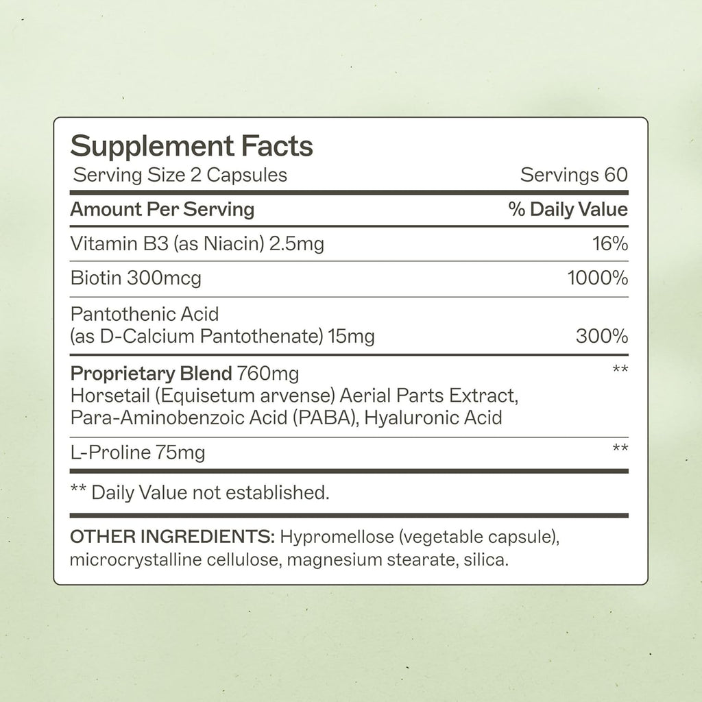 Biotin, Niacin Vitamin B3, Pantothenic Acid (D-Calcium Pantothenate), Horsetail, PABA, Hyaluronic Acid, L-Proline. OTHER INGREDIENTS: Hypromellose (vegetable capsule), microcrystalline cellulose, magnesium stearate, silica.