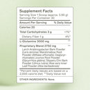 Calories 20 Total Carbohydrates 3 g Dietary Fiber 1 g < 1%* 4%* ** L-Glutamine 3000 mg Proprietary Blend 2750 mg ** Larch Arabinogalactan Bark Powder (Larix laricina), Marshmallow Root Powder (Althaea officinalis), Deglycyr- rhizinated Licorice Root Powder (Glycyrrhiza glabra), Slippery Elm Bark Powder (Ulmus rubra), Aloe vera Inner Leaf Powder (Aloe barbadensis)