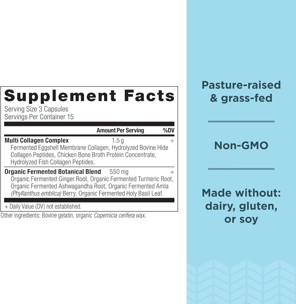 Fermented Eggshell Membrane Collagen, Hydrolyzed Bovine Hide Collagen Peptides, Chicken Bone Broth Protein Concentrate, Hydrolyzed Fish Collagen Peptides, Organic Fermented Ginger Root, Organic Fermented Turmeric Root, Organic Fermented Ashwagandha Root, Organic Fermented Amla (Phyllanthus emblica) Berry, Organic Fermented Holy Basil Leaf, Gelatin