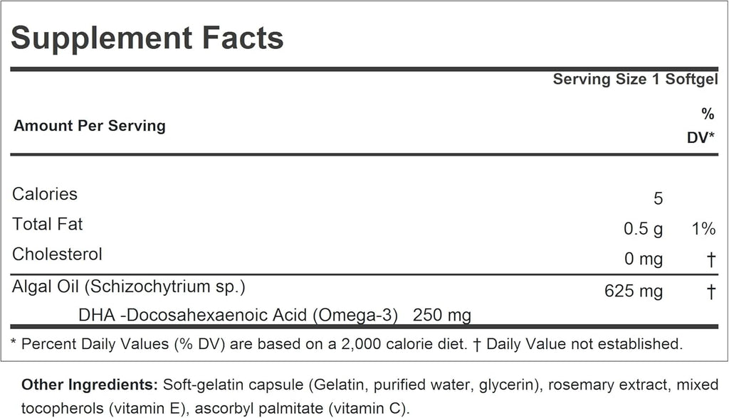 Algal Oil, DHA – CONTAINS NO Milk, soy, yeast, corn, wheat, gluten, sodium, salt, sugar, starch, cholesterol, emulsifier, wax, binder, filler, excipient, lubricant, coating, diluent, flowing agent, common allergens, color, flavor, sweetener or preservative. CONTAINS NO ADDITIVES OF ANY KIND.