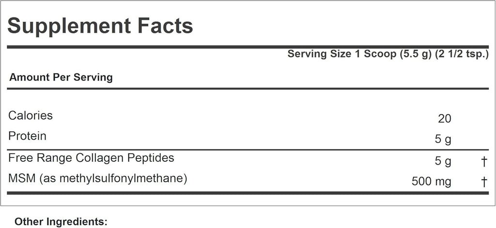 - Superior pure bio-active ingredients - Provides a unique source of highly soluble and absorbable of Free Range Collagen Peptides derived from grass-fed, pasture-raised cows and Methyl-Sulfonyl-Methane (MSM). Contains no Milk / Dairy-Free, Gluten Free; no soy, yeast, corn, wheat, sodium, salt, sugar, starch, fat, cholesterol, oil, emulsifier, wax, binder, filler, excipient, lubricant, coating, diluent, flowing agent, color, flavor, sweetener or preservative.