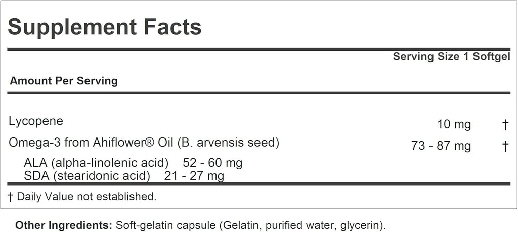 - High levels of the powerful, anti-oxidant carotenoid lycopene in its natural form - Provides many times more Lycopene than leading multivitamins, to deliver powerful anti-oxidant protection & support the health of a broad range of body tissues. Extremely powerful, fat-soluble anti-oxidant that protects a wide variety of fat-based tissues & organs from free-radical damage. Our pure, natural Lycopene is enhanced with a unique balance of plant-based Omega-3 fatty acids from Ahiflower Oil