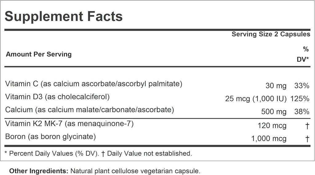 Boron, Calcium, Vitamin C, Vitamin D3, Vitamin K2 Mk-7