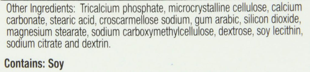 Tricalcium phosphate, microcrystalline cellulose, calcium carbonate, stearic acid, croscarmellose sodium, gum arabic, silicon dioxide, magnesium stearate, sodium carboxymethylcellulose, dextrose, soy lecithin, sodium citrate and dextrin.Contains: Soy.