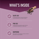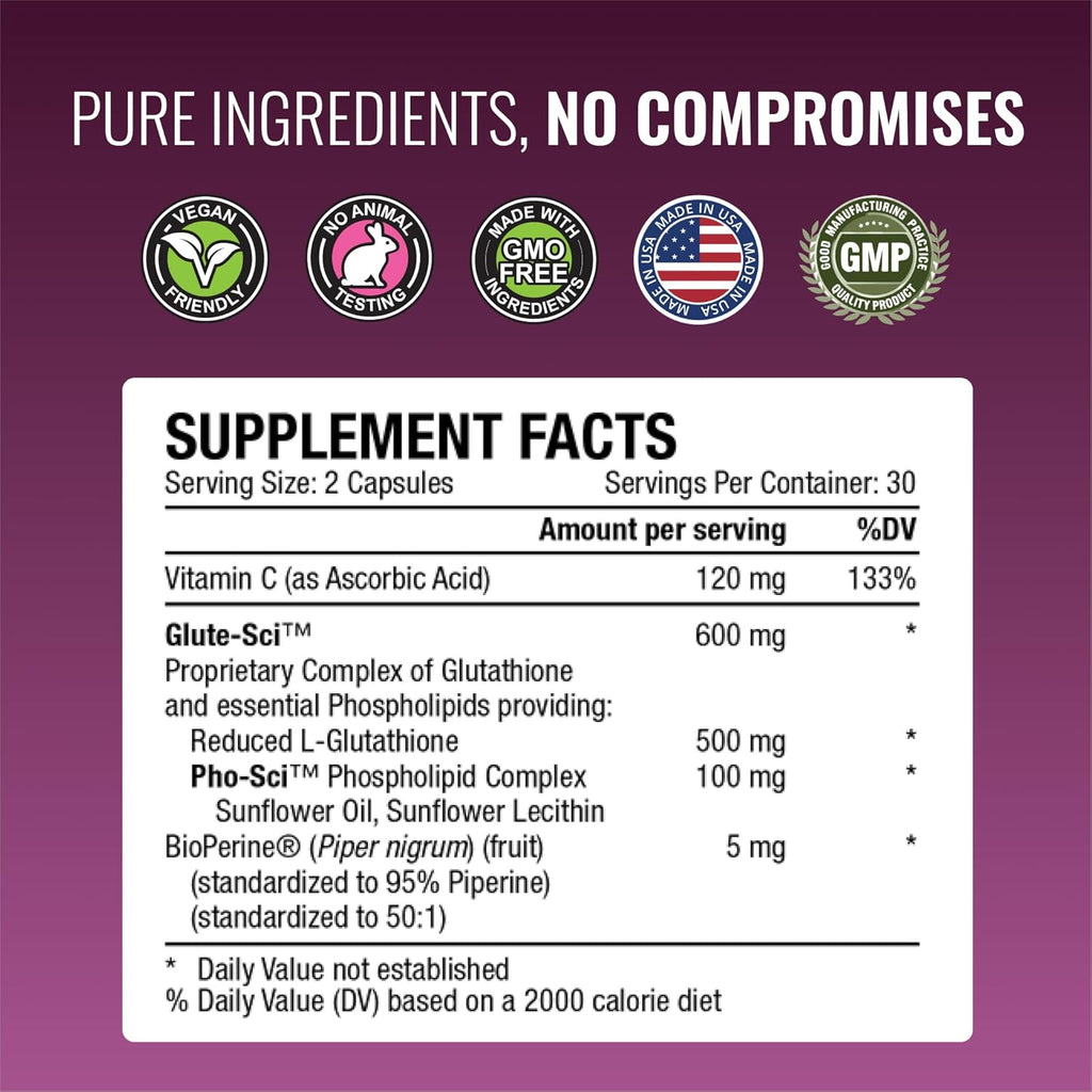Vitamin C (as Ascorbic Acid), "Sci-Glute™ Reduced Liposomal Glutathione Complex - Reduced Glutathione 500 mg - Pho-Sci™ Phospholipid Complex 100 mg - (Sunflower Oil, Sunflower Lecithin)" BioPerine® (Piper nigrum) (fruits) (standardized to 95% Piperine) (standardized to 50:1), Vegetable Capsules, Magnesium Stearate, Silicon Dioxide.