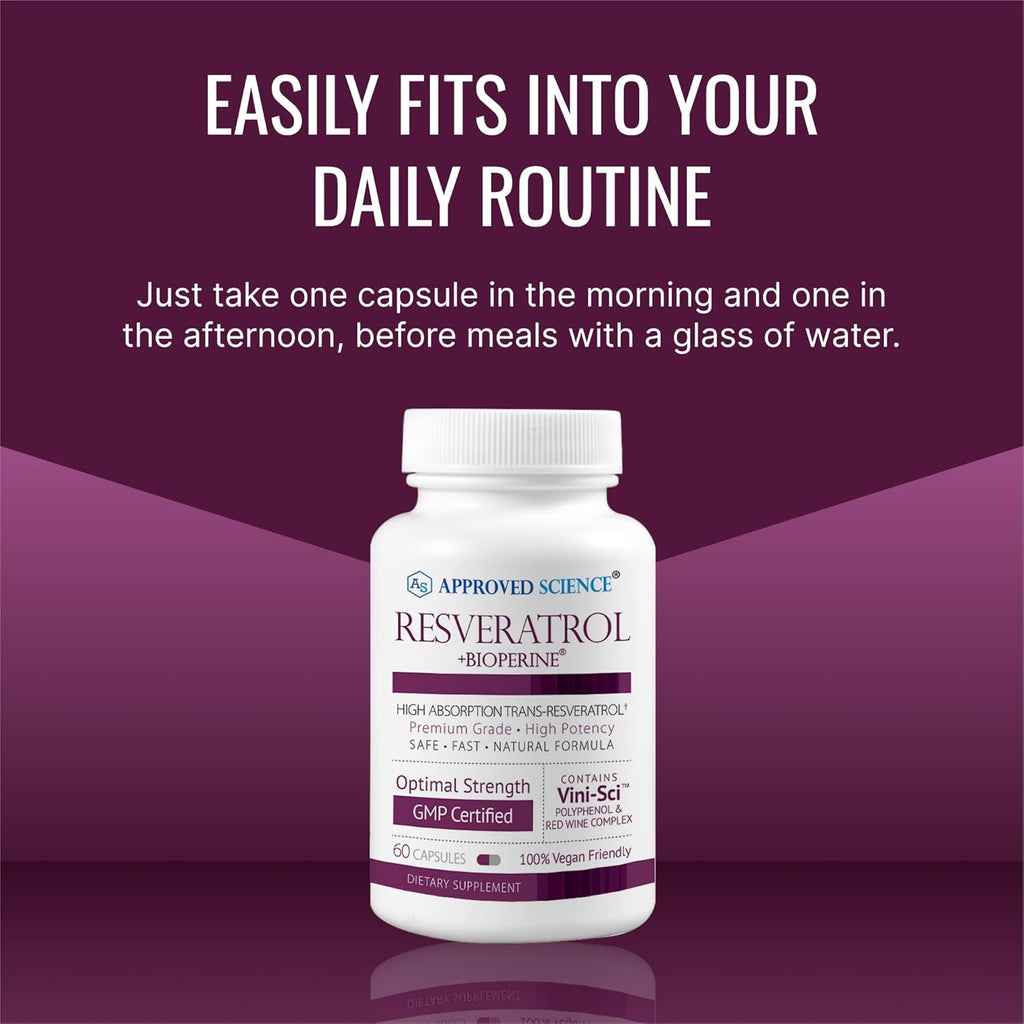 - Bioavailablity - Approved Science Resveratrol contains 5mg of Bioperine, which increases absorption and provides faster results.