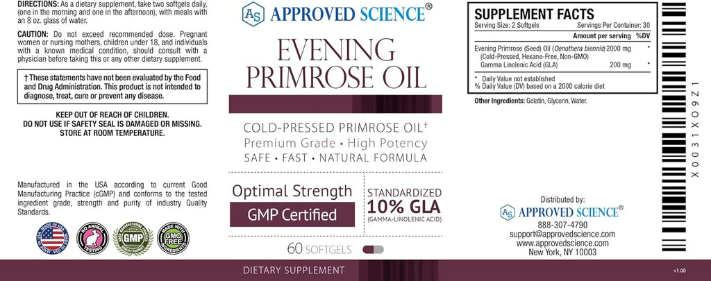 Approved Science Evening Primrose Oil supports hormonal imbalances that may cause hot flashes, night sweats, or mood changes. This formula also aims to boost overall heart health and blood flow. Approved Science Evening Primrose Oil also restores the skin’s tone and elasticity, minimizes fine lines and wrinkles promoting healthy skin.