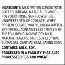 INGREDIENTS: MILK PROTEIN CONCENTRATE, BUTTER (CREAM, NATURAL FLAVOR), SUNFLOWER OIL, POLYDEXTROSE, UNSWEETENED CHOCOLATE, ERYTHRITOL, WHEY PROTEIN ISOLATE, COCOA BUTTER, WATER. CONTAINS LESS THAN 2% OF THE FOLLOWING: SOLUBLE CORN FIBER, SODIUM CASEINATE, NATURAL FLAVORS, SALT, SOY LECITHIN, SUCRALOSE, BUTTERFAT, XANTHAN GUM, BAKING SODA. CONTAINS: MILK, SOY. PROCESSED IN A FACILITY THAT ALSO PROCESSES EGGS AND WHEAT.