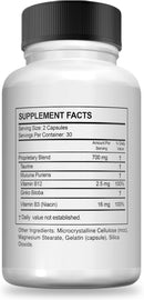 Taurine, Mucuna Puriens, Vitamin B12, Ginko Biloba, Vitamin B3 (Niacin), Microcrystalline Cellulose (mcc), Magnesium Stearate, Gelatin (capsule), Silica Dioxide.