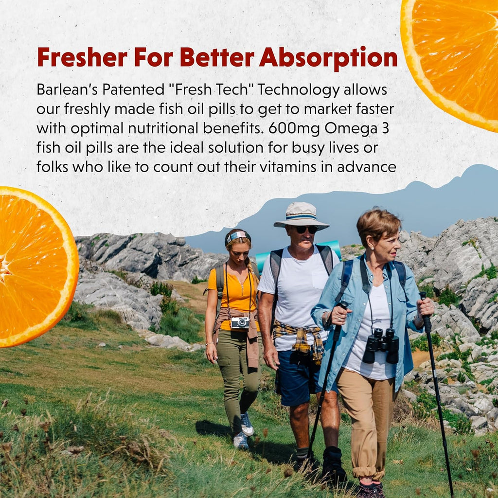 - FRESHER FOR BETTER ABSORBPTION: Barlean’s Patented "Fresh Tech" Technology allows our freshly made fish oil pills to get to market faster with optimal nutritional benefits. 1000mg Omega 3 fish oil pills are the ideal solution for busy lives or folks who like to count out their vitamins in advance