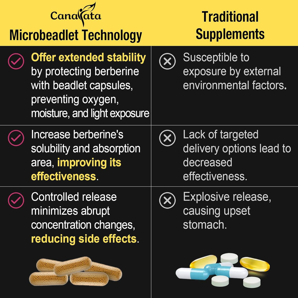- Innovative Microbeadlet Technology: Canarata advanced microbeadlet technology enhances the efficacy of berberine HCL and is gentle on the stomach, with a lipid coating that protects berberine from oxygen and moisture for improved stability and potency