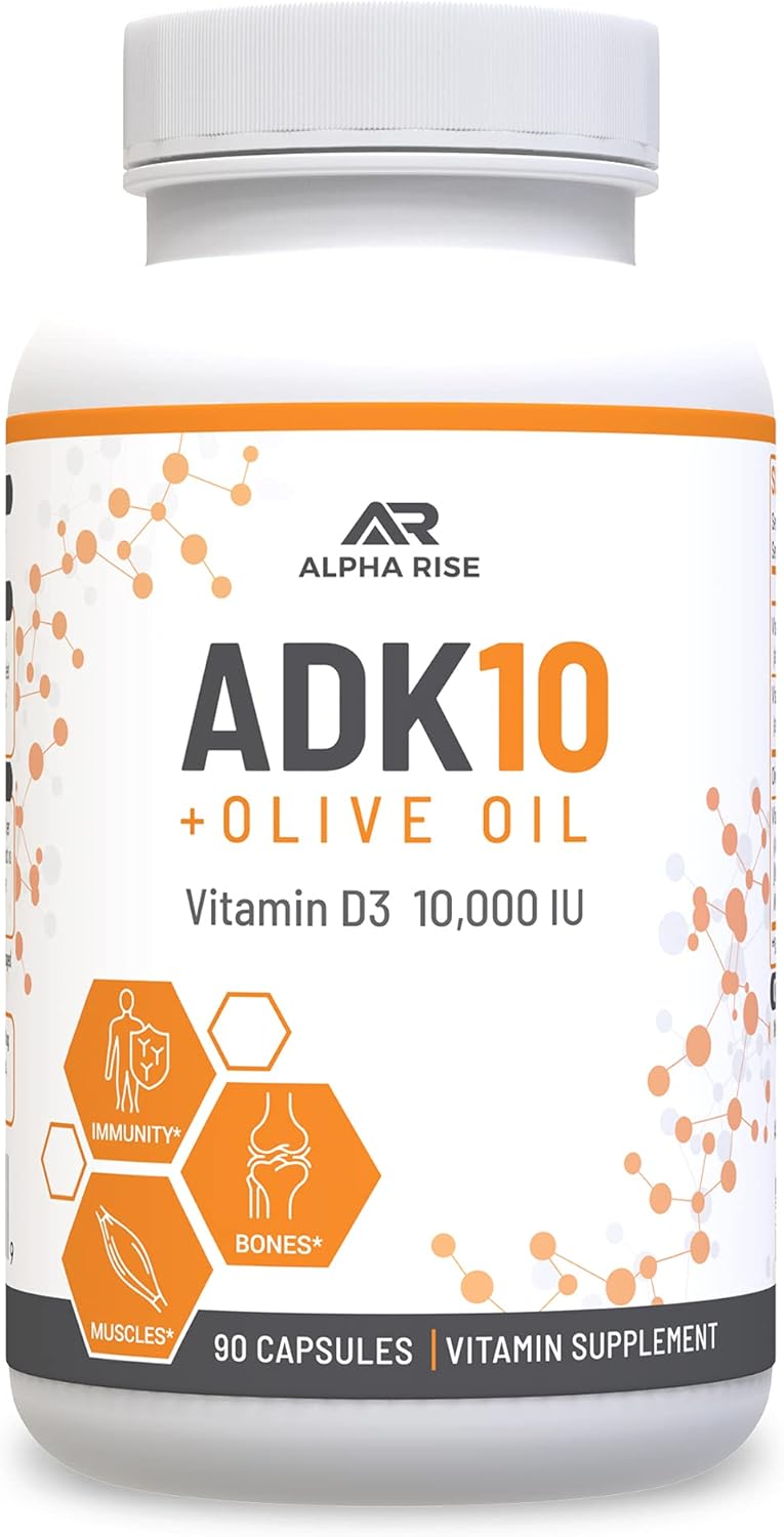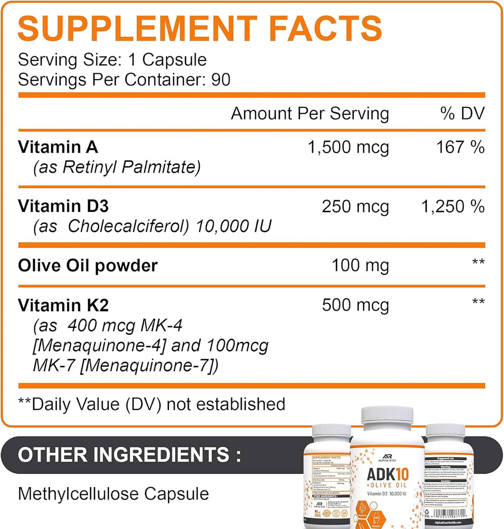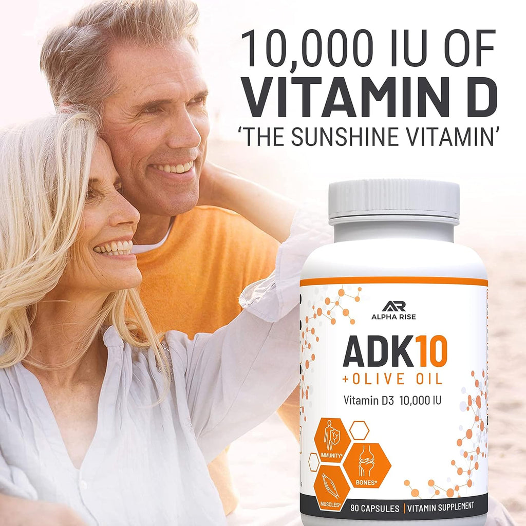 - GREAT VALUE 3-in-1 formula. SUPPORTS HEALTHY BONES, SKIN, HEART, IMMUNITY and MUSCLES. Powerful formulation ADK 10 VItamin Supplement. Vitamin D 10000 iu with K2 (MK7 + MK4) and Vitamin A (Retinyl Palmitate) 5000 iu.
