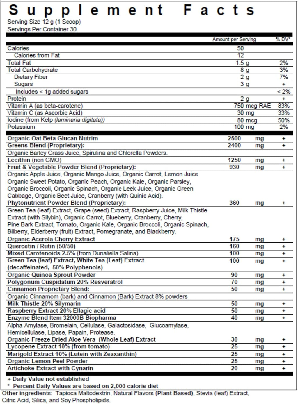 Barley grass juice, Spirulina, Chlorella, Green Tea Extract, Silybin (from Milk Thistle), Grape Seed Extract, Blueberry, Cranberry, Raspberry, Tart Cherry, Pine Bark Extract, Broccoli, Tomato, Carrot, Spinach, Kale, Bilberry, Elderberry, Pomegranate, Blackberry, Quercetin/Rutin, Rice Bran Soluble, Raspberry Extract, Aloe Vera Powder Extract, Apple, Mango, Lemon, Sweet Potato, Peach, Parsley, Leek, Cabbage, Beet, Cranberry, Acerola Cherry Powder, Green Tea Extract, White Tea Extract, Polygonum Cuspidatum, Oat Beta Glucan, Cinnamon Blend, Milk Thistle, Marigold Extract, Dunaliella Salina, Enzymes-Alpha Amylase, Bromelain, Cellulase, Galactosidase, Glucoamylase, Hemicellulase, Lipase, Papain, Protease, Lecithin non-GMO, Lycopene Extract, Lemon Peel Powder, Artichoke Extract, Atlantic Kelp Powder, Stevia Leaf Crystals, Natural Flavors Plant Base, Citric Acid, Soy Phospholipids