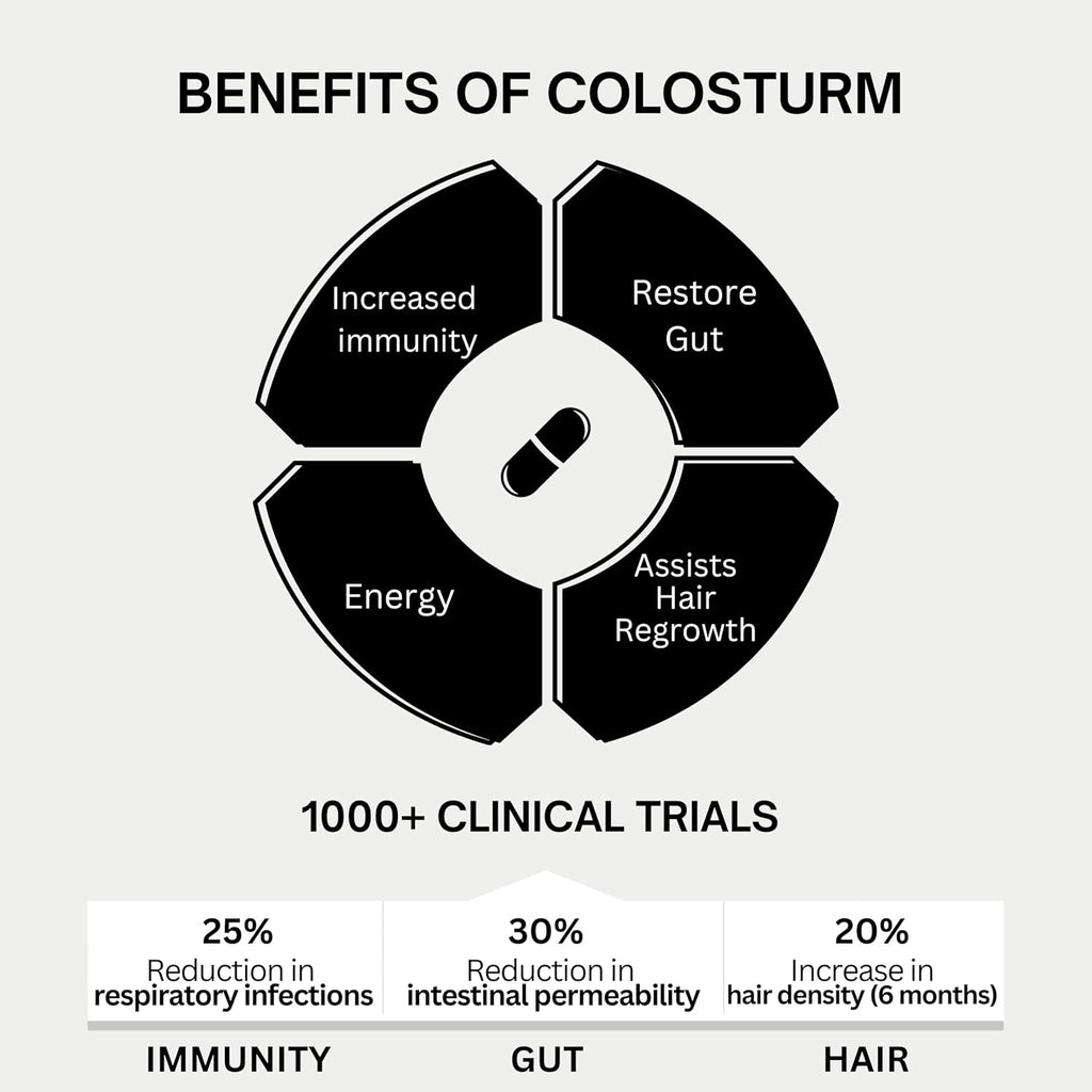 - COLOSTRUM CAPSULES (IMMUNE SUPPORT, GUT HEALTH, HAIR): Unleash a myriad of benefits with our colostrum capsule supplement—immune support, gut health, muscle support, hair growth support. Packed with bioactive compounds like immunoglobulins and antioxidants, our colostrum remains a superfood championing overall health.