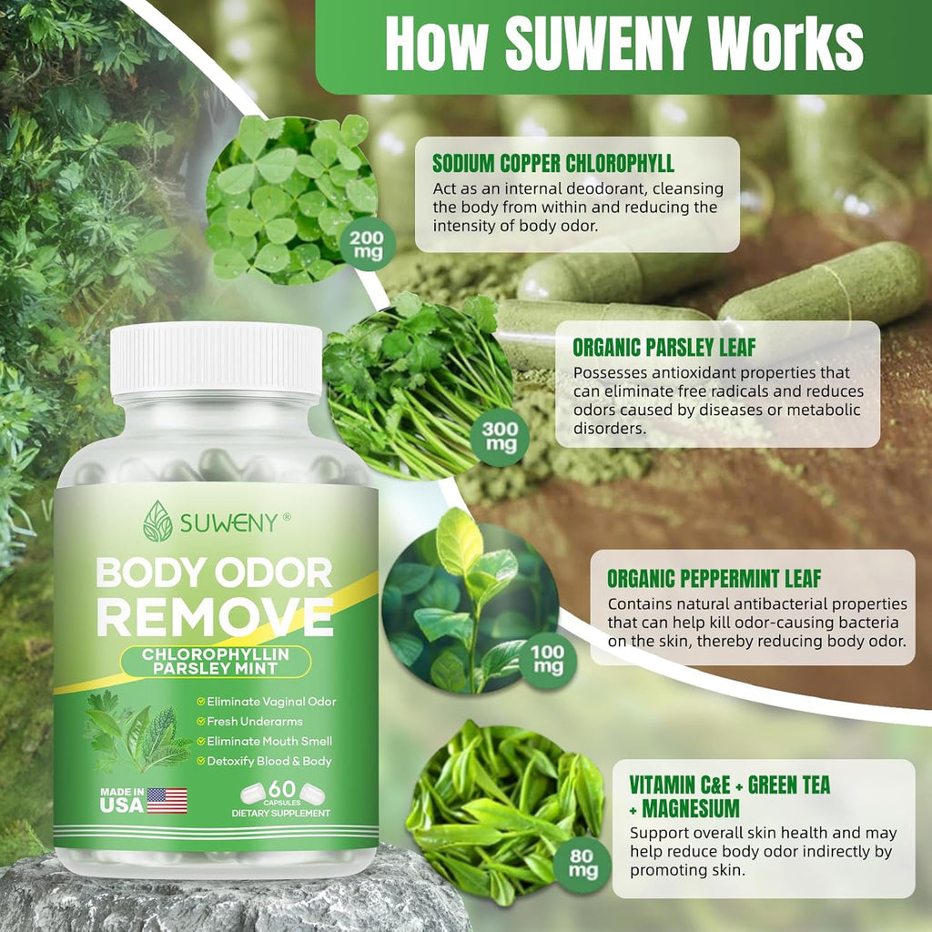 - Powerful Deodorization: SUWENY Body Deodorizing Supplement uses natural ingredients like Sodium Copper Chlorophyllin, Parsley Leaf, and Peppermint Leaf to effectively remove body, vaginal, and mouth odors, keeping you fresh.