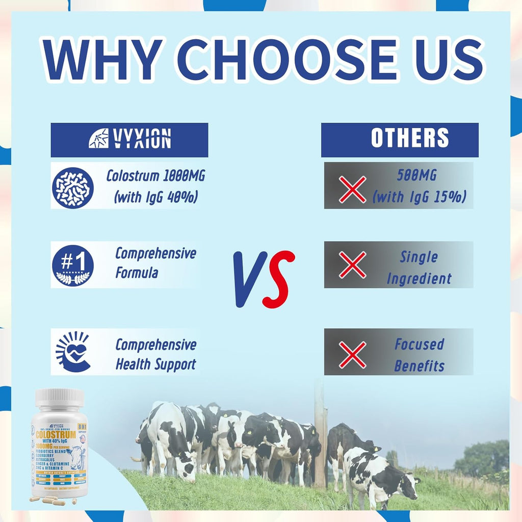 - 8-in-One Colostrum Supplement for Total Wellness: VYXION's 8-in-One Colostrum Supplement offers an all-natural, powerful blend of bovine colostrum and over 400 bioactive nutrients to support your immune system, digestion, skin, and energy levels. Sourced from grass-fed cows, this colostrum supplement provides 1000mg of premium bovine colostrum with 400mg of Immunoglobulins (IgG) to enhance immune defense and overall health.