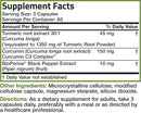 Turmeric Root Powder (Curcuma longa) (from 30:1 extract), Curcumin (Curcuma longa root extract) Curcumin C3 Complex, BioPerine® Black Pepper Extract (Piper nigrum) (fruit) (standardized to contain 95% piperine) Other Ingredients: Modified cellulose capsule, microcrystalline cellulose, magnesium stearate, silicon dioxide.