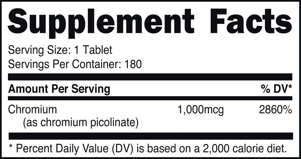 - Content & Quantity: Each bottle contains 180 tablets, with each tablet providing 1000mcg of Chromium Picolinate, totaling 180 servings
