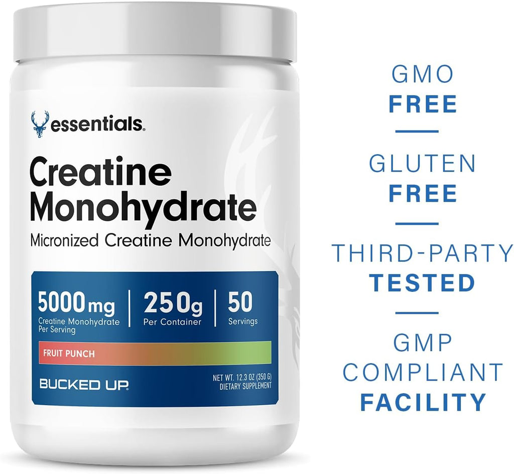 Unlock your fitness potential with Bucked Up Fruit Punch Creatine For Women and Men, a delicious and easy-to-mix creatine flavored powder that delivers 5G of creatine monohydrate per serving, available in an irresistible fruit punch flavor, along with other enticing options like blue rasperry, grape apple, and pineapple mango, ensuring you enjoy every scoop of this vegetarian-friendly creatine powder flavored to perfection, all made in the USA for quality you can trust—50 servings in each 250-gram container for your ultimate workout experience!
