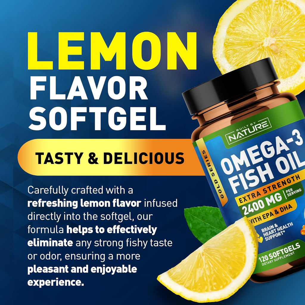 Experience the powerful benefits of Omega 3 with Built By Nature Fish Oil. Our high-potency formula provides 2400mg of fish oil, rich in EPA and DHA, to support heart and brain health. Sourced from wild-caught sardines, this supplement is not only effective but also eco-friendly, ensuring sustainability. Specially formulated with lemon flavor in the softgel to help prevent any strong fishy taste or smell. With a commitment to purity, Built By Nature Fish Oil is non-GMO, gluten-free, and free from harmful additives, offering a clean and natural choice for your wellness journey.