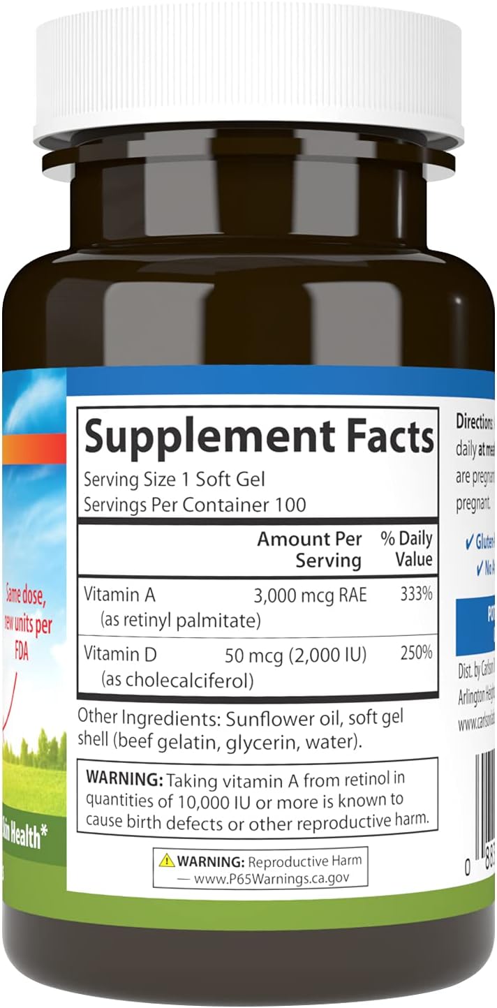 - 10,000 IU (3,000 mcg RAE) of vitamin A and 5,000 IU (125 mcg) of vitamin D3