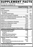 CarnoSyn Beta-Alanine, L-Arginine, BetaPower Betaine Anhydrous, Creatine Nitrate (as NO3-T), Taurine, Caffeine Anhydrous, Toothed Clubmoss (Huperzia serrata) aerial parts extract, Citric Acid, Silicon Dioxide, Malic Acid, Natural & Artificial Flavors, Calcium Silicate, Potassium Citrate, Sucralose, Acesulfame Potassium