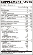 Vitamin B6 (as Pyridoxal-5-Phosphate), Folate (as 6S-5-Methyltetrahydrofolate calcium salt), Vitamin B12 (as Methylcobalamin), Calcium, Phosphorus (as Dipotassium Phosphate), Magnesium (as Magnesium Citrate), Chloride (from Sea Salt), Sodium (from Sea Salt), Potassium (as Dipotassium Phosphate), CarnoSyn® Beta-Alanine, Velox® Patented Performance Blend, L-Citrulline, L-Arginine, BetaPower® Betaine Anhydrous, PeptiPump® Bioactive Lentil Peptides, Creatine Nitrate (as NO3-T®), L-Tyrosine, Caffeine Anhydrous, Dynamine™ (as Methylliberine), TeaCrine® (as Theacrine), Toothed Clubmoss (Huperzia serrata) aerial parts extract (std. 1% Huperzine A), Rauwolfia vomitoria root bark extract.