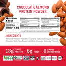 - The chocolate you crave with all of the good and none of the bad. Chocoholics everywhere will love this vegan almond protein powder that provides the protein fuel they need with 13 grams of plant protein, 6 grams of fiber, all from six simple ingredients including 1000 blanched California Almonds