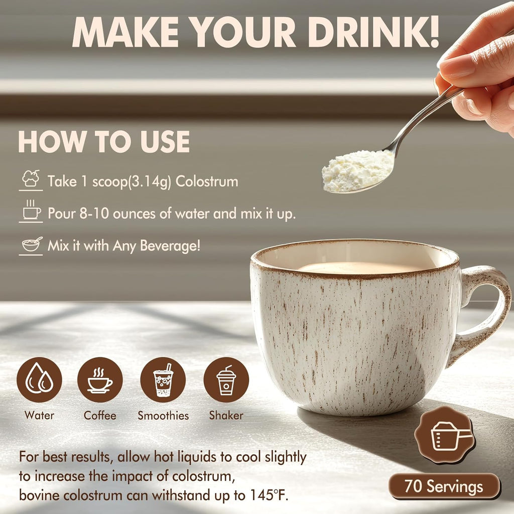 - Easy to Mix: Whether you mix the bovine colostrum superfood into water, smoothies, or coffee, this denim colostrum can be easily blended with it without clumping and no hassle. Please note that for best results, please cool the hot drink a little before adding it to improve colostrum activity. Cow colostrum can tolerate temperatures up to 145°F (approximately 63°C).