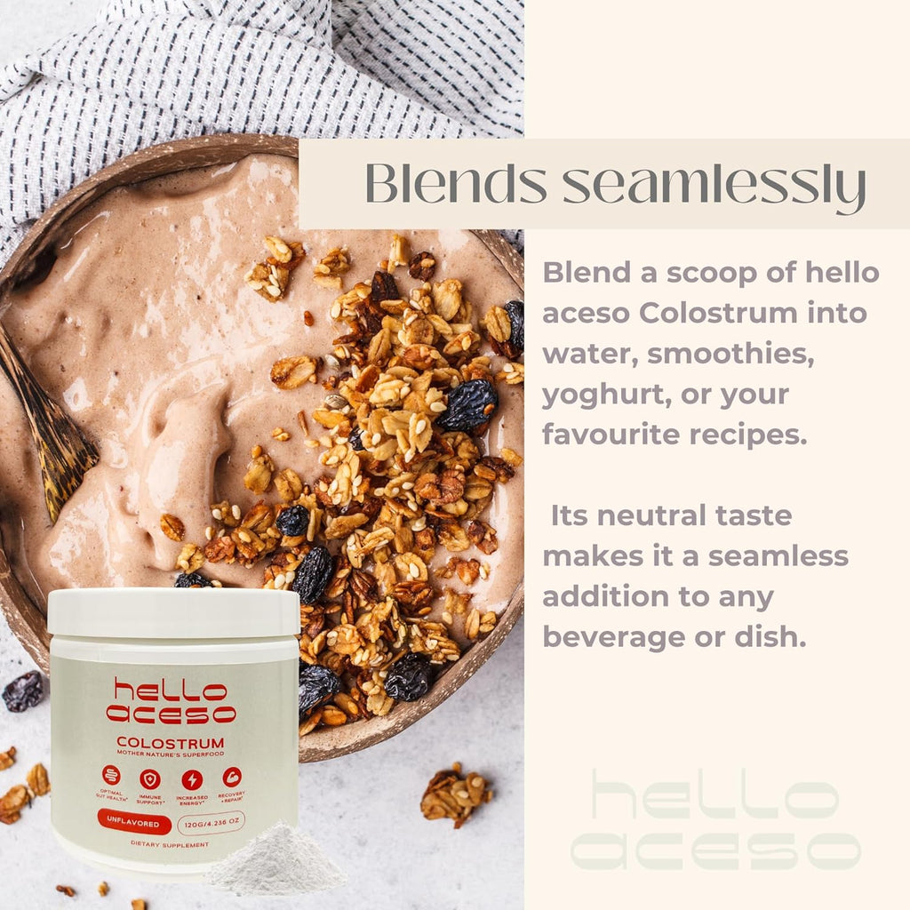- Convenient Powder Form: Incorporate our unflavored bovine colostrum for women and men into your daily routine by simply mixing it in your smoothie, juice, water or even yoghurt.