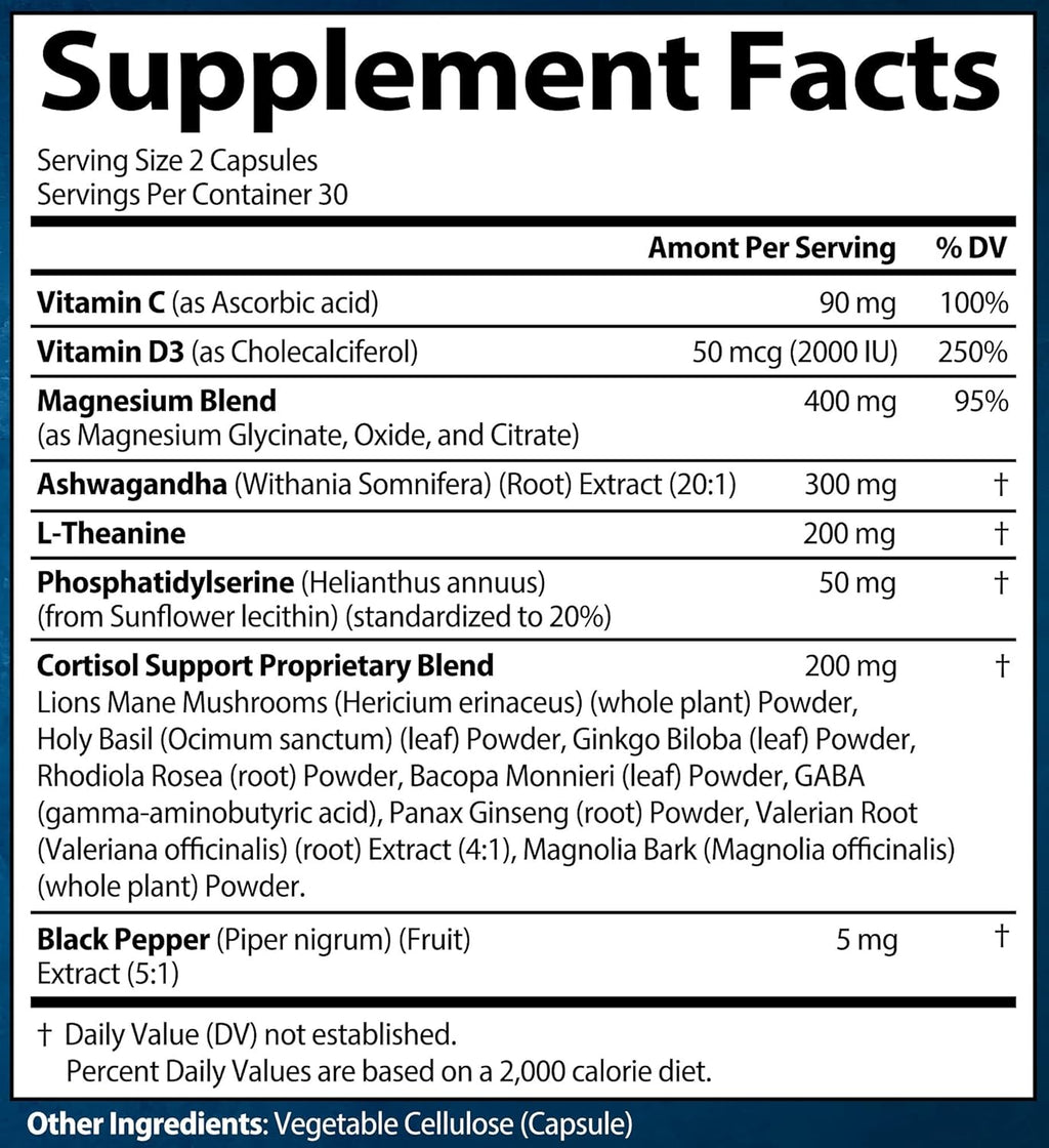 Magnesium, Ashwagandha, L-Theanine, Phosphatidylserine, Vitamin C, Vitamin D3, Black Pepper, Cortisol Support Proprietary Blend