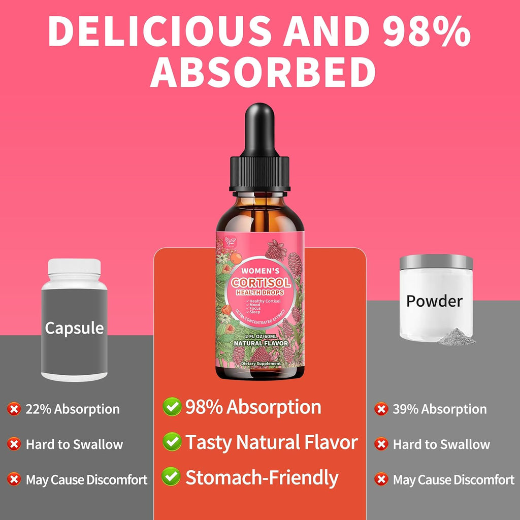 - High Absorption: Having trouble swallowing capsules, powders or gummies? Game-changing Cortisol Wellness Drops absorb 5 times more powerfully than Cortisol capsules, Cortisol powders or Cortisol gummies, making it easy to enjoy relaxation and focus anytime, anywhere. This means you don't have to worry about wasting nutrients, and every drop delivers tangible benefits to your health.