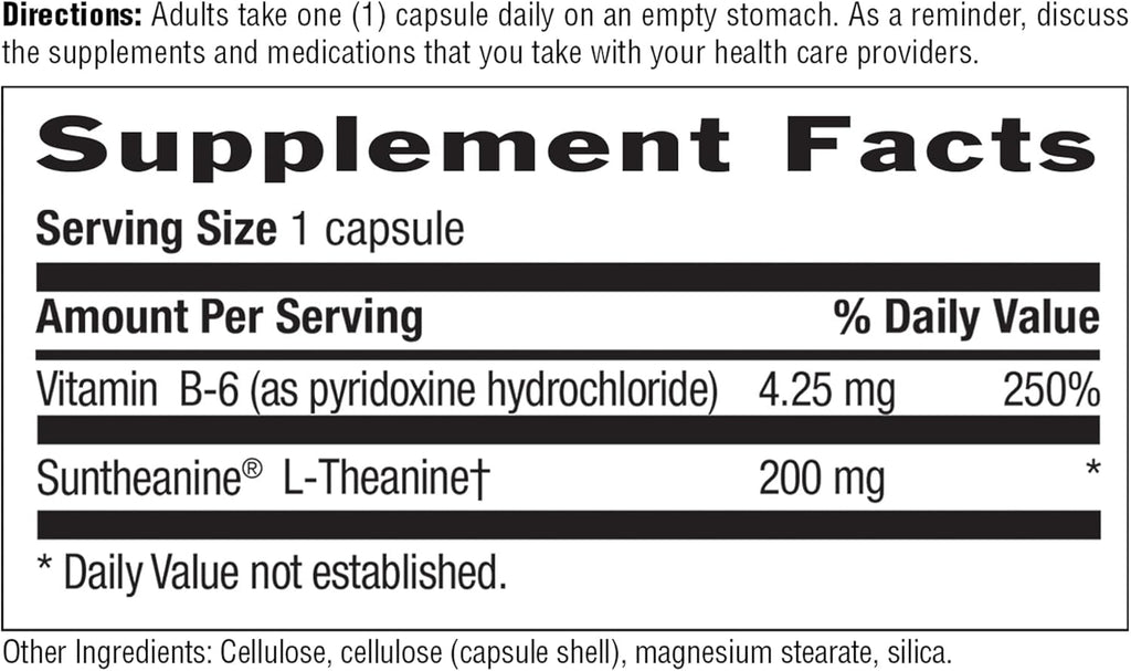 VITAMIN B-6 (AS PYRIDOXINE HYDROCHLORIDE) 5; SUNTHEANINE L-THEANINE 200; DAILY VALUE STATEMENT, DAILY VALUE NOT ESTABLISHED. OTHER INGREDIENTS CELLULOSE (CAPSULE SHELL), CELLULOSE, MAGNESIUM STEARATE, SILICA.