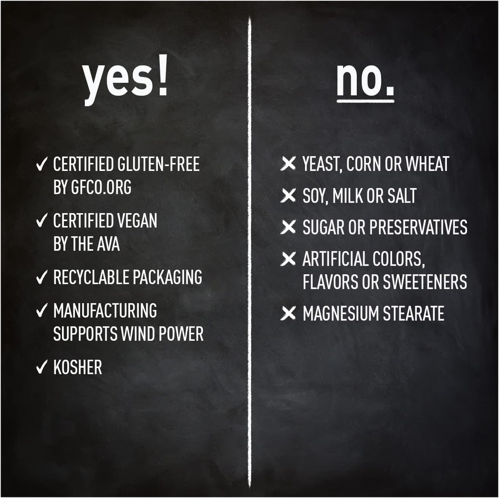 - Clean, Responsible Formulation: Certified Gluten Free, Vegan, and Kosher—made without magnesium stearate, wheat, soy, milk, preservatives, or artificial colors. Manufactured using wind-powered renewable energy in recyclable packaging.*