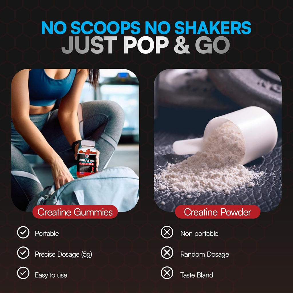 - Energy Gummies + Muscle Muilder All in One – Not just for the pump—these powerful creatine nutritional supplements double as boost gummies for clean energy and mental focus. Whether you're chasing gains or tackling busy days, this is your go-to.