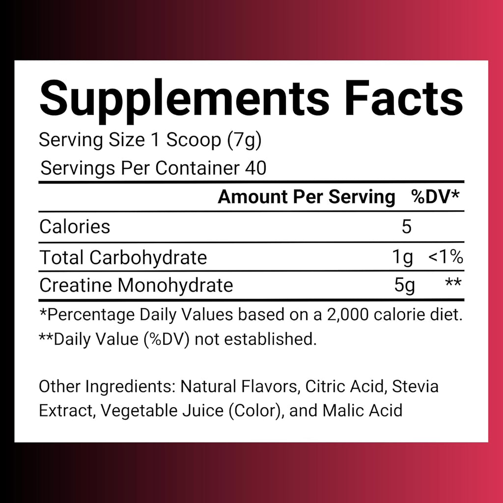 creatine monohydrate, natural flavors, citric acid, stevia extract, vegetable juice (color), and malic acid