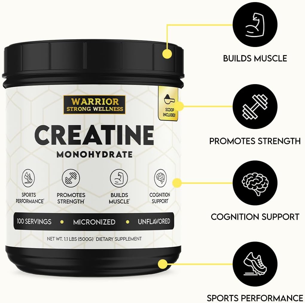 - RAPID ABSORPTION: Warrior Strong Wellness' Pure creatine monohydrate allows for fast absorption which enhances gains, strength, and increases training capacity.
